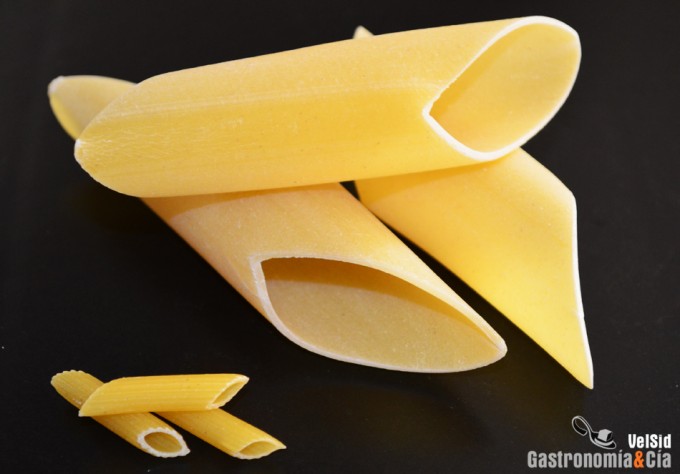Los pennoni también son cilindros elaborados con sémola de trigo duro, lisos o estriados, con el corte oblicuo en los extremos, pero con un tamaño mayor que el de los clásicos penne, son plumas grandes. Hay que decir que hay pennoni que son simplemente un poco más grandes que los penne y también los hay que son casi tan grandes como la pasta para canelones con forma de cilindro, como los que podéis ver en la foto superior.