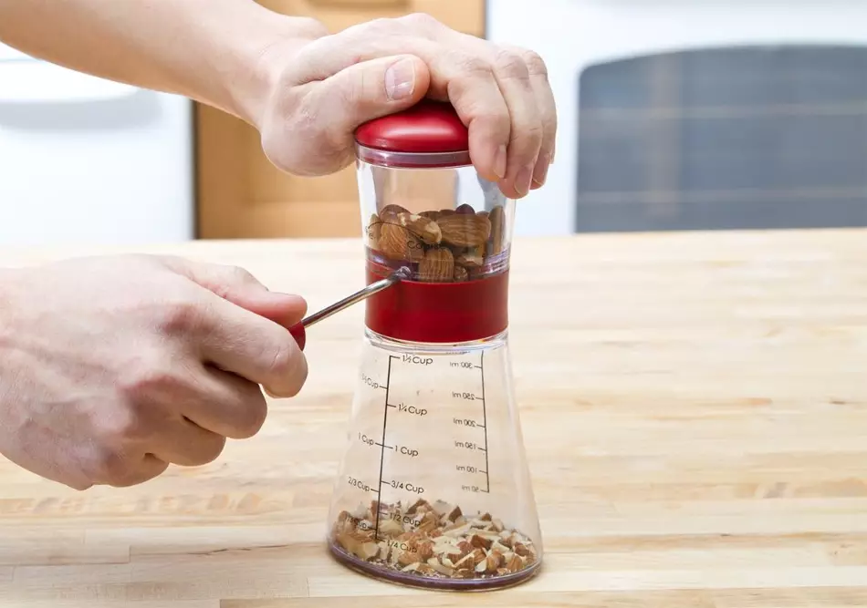 Se llama Prepworks nut chopper, está fabricado en materiales plásticos resistentes, silicona y acero inoxidable, por lo que una vez utilizado, puede lavarse en el lavavajillas. Su uso es muy sencillo, simplemente se introducen los frutos secos por la parte superior y se gira la manivela para que las cuchillas rompan los frutos secos y pasen al recipiente inferior, que tiene una capacidad de 1 1/3 tazas o unos 320 ml.
