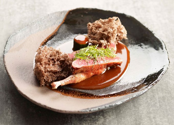 Triturar el ½ litro de jugo de pichón reducido con 15 gramos de paté de olivas y 70 gramos de anchoa del Cantábrico. Colar y ligar con kuzu.