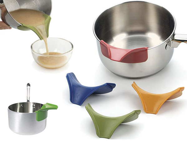 Bien es cierto que en muchos casos se puede utilizar un embudo, pero en muchos otros hasta este utensilio resulta poco práctico. La firma estadounidense RSVP ha diseñado el accesorio que hasta ahora nos parece el más cómodo, fácil y limpio para dirigir el vertido de los ingredientes a otro recipiente, y no sólo líquidos, el pico vertedor adaptable también puede resultar útil para ingredientes secos.