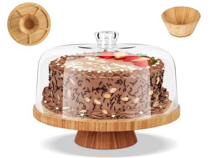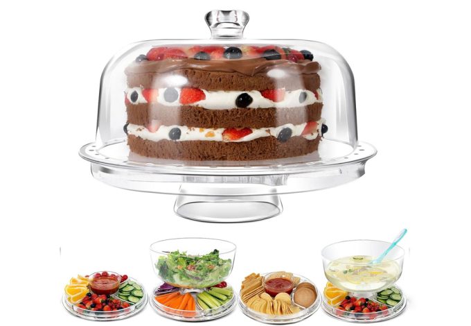 El segundo modelo de pie de tarta multifunción está también fabricado en plástico AS, y además de las tres piezas, bandeja, campana y soporte para la bandeja, incluye cucharas para servir ensaladas, bebidas y demás. En cuanto a las medidas, son similares, la altura total como cake stand ronda los 20 centímetros, el diámetro de la base los 30 centímetros, y el de la campana 27’2 centímetros.
