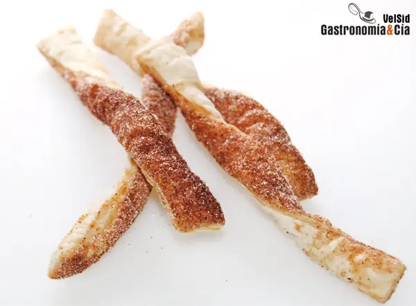 Cuando hacemos una masa de pastelería y repostería, como masa quebrada, hojaldre o similares, muchas veces nos quedan recortes. A veces nos habéis preguntado qué hacer con estos recortes de masa, sobre todo cuando son masas hojaldradas, pues volverlas a amasar hace que pierdan su capacidad de crecer como ‘milhojas’. En casa lo que habitualmente hacemos es espolvorear azúcar o especias, según sea una masa dulce o salada, pintar con huevo o almíbar y hornear. Podría decirse que es un snack de recompensa del cocinero, pues al no ser piezas bien formadas o con la estética que queremos presentar nuestras elaboraciones, no sale de la cocina.