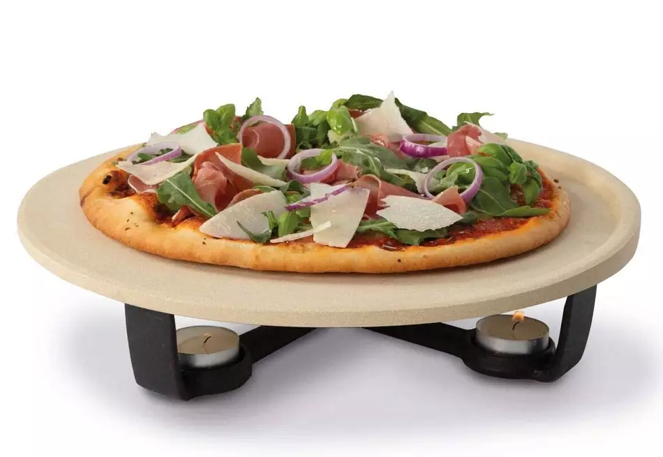 Esta piedra es apta para horno y para barbacoa, por lo que además se puede cocinar la pizza (y otras preparaciones culinarias) en ella. Luego, en la mesa, se coloca sobre un soporte de hierro fundido en el que se incorporan cinco velas ‘calientaplatos’, como se hace con las fondues y demás. Así que tiene tres funciones, una para hornear o cocinar en la barbacoa, otra para servir y la tercera para mantener caliente y crujiente la masa, sea de pizza o empanadas, bocadillos, sándwiches, quiches, hojaldres, quesadillas, tacos, etc.