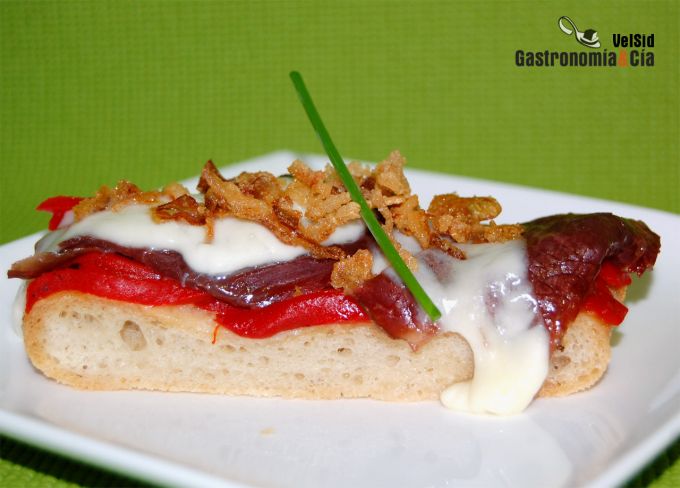 Cuando los pimientos confitados estén hechos, córtalos en tiras finas, y empieza a montar el pincho, colocando sobre el pan el pimiento, cubriendo bien la superficie, su jugo también impregnará de sabor el pan. Sobre el pimiento, reparte las lonchas de cecina y a continuación la mozzarella.