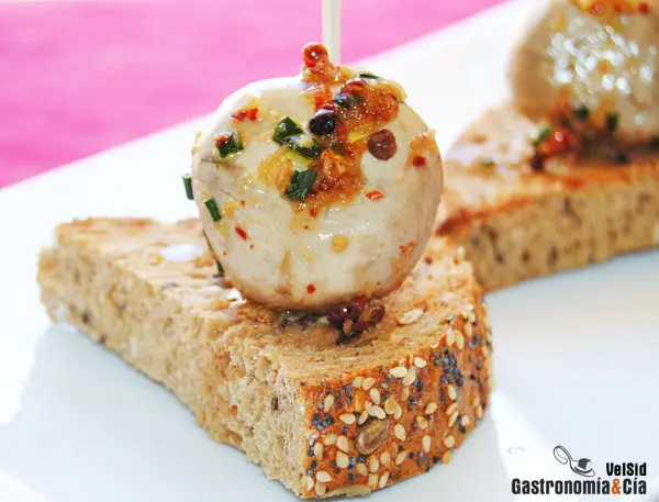 Disfrutar de pinchos y tapas forma parte de nuestra cultura, es un acto social, lúdico, una forma de comer que también puede ser muy saludable y nutritiva, se equivocan quienes piensan que se comen muchas grasas o elaboraciones poco saludables tapeando, y lo podemos comprobar cuando realizamos algunas rutas de pinchos, o cuando los hacemos en casa, qué mejor ejemplo que este Pincho de champiñón marinado sobre pan de semillas.