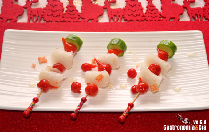 Elige unas brochetas o palillos de aperitivo decoradas y empieza ensartando un pimiento, a continuación un rollito de bacalao ahumado, repite con otro pimiento y otro rollito de bacalao ahumado, de nuevo un pimiento y termina con la rodaja de pepino.