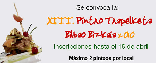 Como todos los años por estas fechas, se abre la convocatoria para inscribirse en la Muestra de Bares de Pintxos Bilbao-Bizkaia, Pintxo Txapelketa 2010. Este certamen está abierto a bares, cafeterías, tabernas, mesones… locales que cuentan con barra de pinchos y quieran mostrar la calidad de sus productos y elaboraciones.