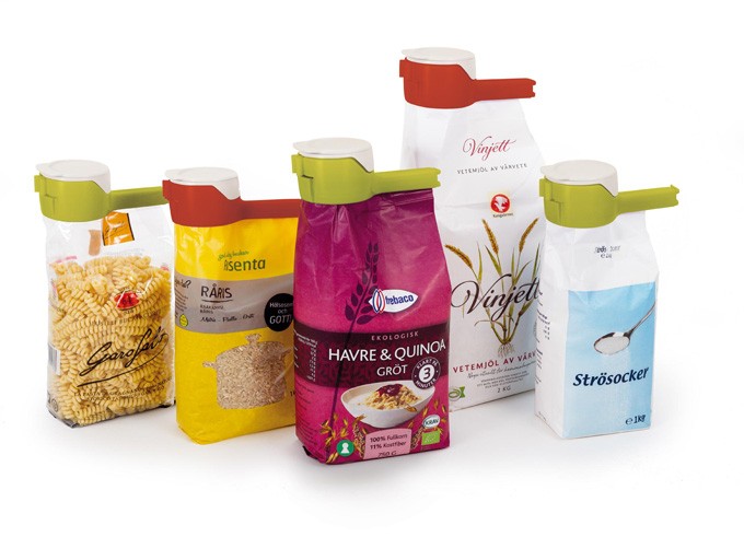 Este tipo de clip con tapón para bolsas de alimentos es económico (el de la primera foto ronda los 2 euros), y además se rentabiliza porque la mayoría tenemos alguna o algunas bolsas de alimentos que se consumen habitualmente y en las que iría bien disponer del práctico dispensador. Como podéis ver en la siguiente imagen, hay disponibilidad en distintos colores, todo depende del fabricante, en este caso son los clips con tapón Twixit de la firma Lindén Sweden, y son algo más caros.