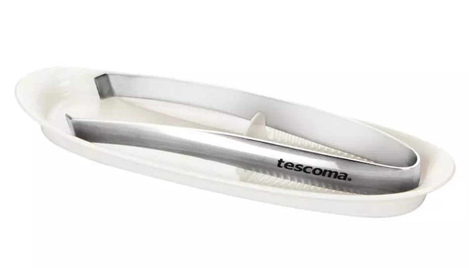 Pues parece ser que la solución puede estar en el complemento con el que se acompaña la pinza para espinas de pescado de Tescoma, es una pequeña bandejita que tiene una parte lisa y otra parte estriada, y esta puede ser la que facilite que las espinas se despeguen de la pinza. Pero esta no es la única funcionalidad de la bandeja, este modelo de pinza para espinas de pescado de la línea Presto también está pensado para poder quitar las espinas cuando el pescado ya se ha cocinado, así que tiene un diseño sencillo pero moderno y elegante para poder llevarlo a la mesa.