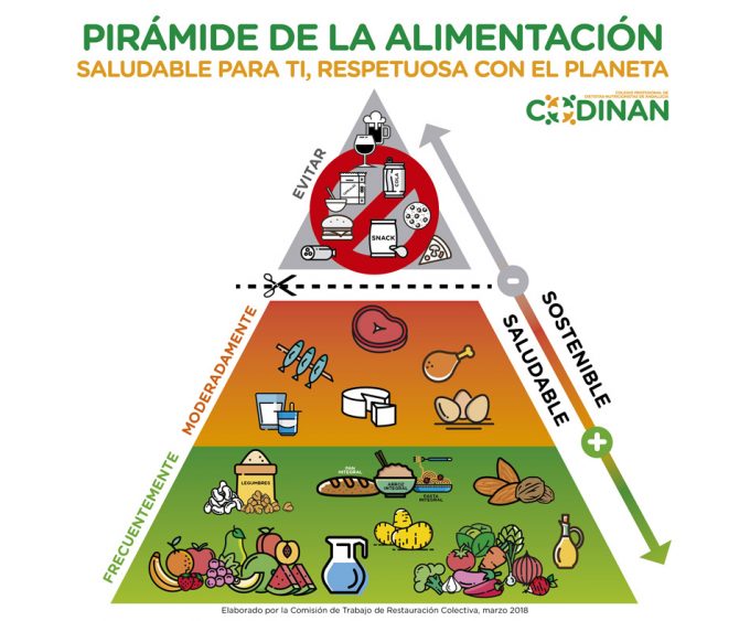 El Colegio Profesional de Dietistas-Nutricionistas de Andalucía (CODINAN) dice haber elaborado la primera pirámide de la alimentación en la que se establece una íntima relación entre salud y sostenibilidad, y en la que, además, se aconseja evitar el consumo de alimentos o productos ultraprocesados. Como se puede apreciar en la ilustración, la Pirámide de la Alimentación de CODINAN señala que la base de la alimentación debe estar constituida por alimentos de origen vegetal y que los productos de origen animal deben tomarse con moderación.