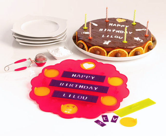 El uso de la plantilla es muy fácil, como podéis deducir viendo las fotos, simplemente se trata de colocar las letras necesarias para la felicitación, que irá en el centro del pastel y tiene hasta tres líneas, y se puede completar con los números en el caso de cumpleaños o aniversario, y con distintos motivos decorativos alrededor.