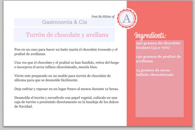 Hay tres plantillas o tarjetas para recetas diferentes, son las que podéis ver en las imágenes en las que os hemos presentado el Turrón de chocolate y avellana, las Navajas con salsa de soja y la Mermelada de mandarina. Sería redondo si se pudiera insertar una pequeña foto de la presentación de la receta.