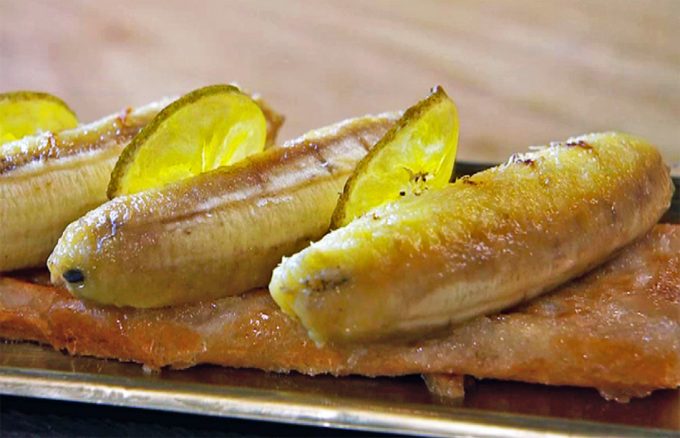 A continuación podéis ver que son pocos los ingredientes que se necesitan para hacer este postre, además, se puede considerar una receta de aprovechamiento, pues como bien sabéis, las torrijas se hacen con el pan del día anterior, y los plátanos, si están empezando a estar muy maduros como para comerlos a bocados, entre muchas otras cosas, se pueden cocinar. En esta receta de Sergio y Javier Torres los plátanos se asan en su propia piel, como si fuera un papillote, después se disfruta de una fruta súper dulce, melosa… deliciosa. Os va a encantar.