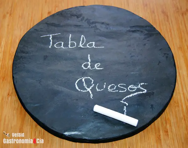 Y si disponéis de la mencionada pintura pizarra, y tenéis una bandeja de cerámica a la que deseéis cambiarle el aspecto, aquí podéis ver convertirla en una tabla de pizarra para quesos.