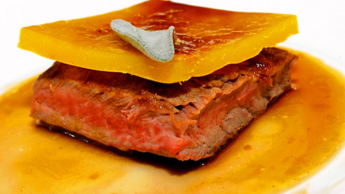 Cortamos la gelatina de melocotón y la carne con el mismo molde para que tengan en mismo tamaño y forma, y caramelizamos con ayuda de un soplete de cocina.