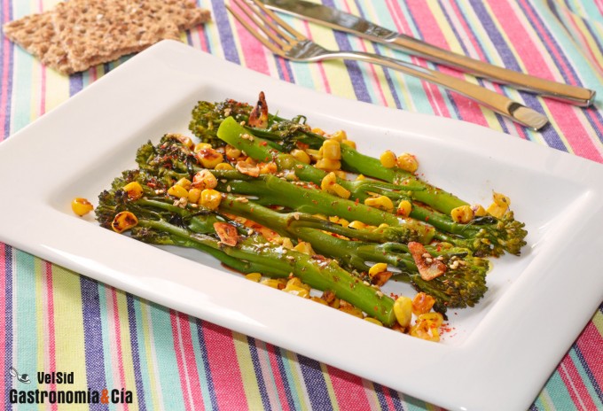 Pon la parrilla (también puedes hacerlo en una plancha o en la misma sartén) a calentar con un poco de aceite de oliva virgen extra y dora el bimi y el maíz dulce descongelado y bien escurrido, condimenta con un poco de sal y añade los ajos laminados para que también se doren y aporten su sabor.