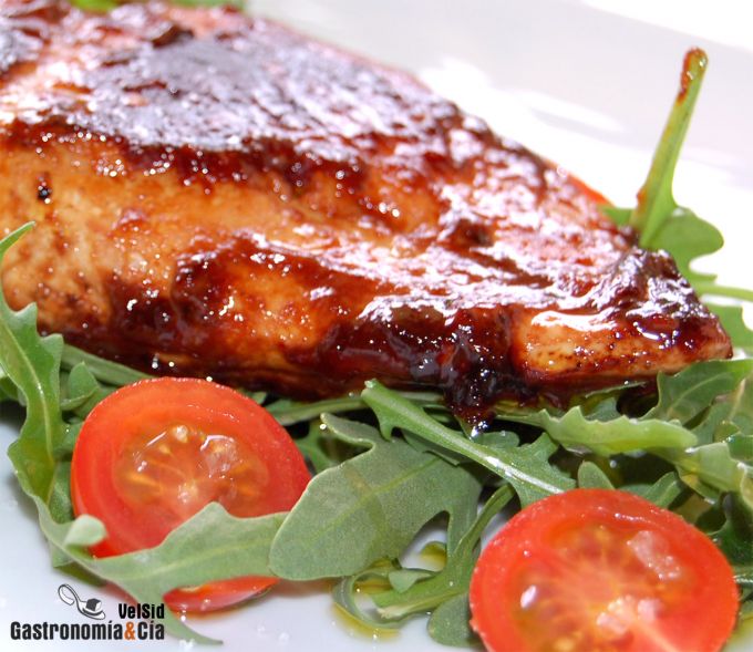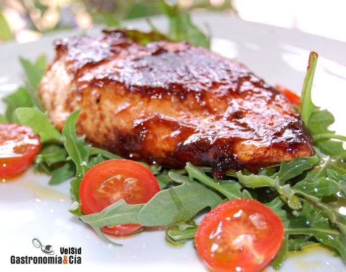 Cada vez que le des la vuelta pinta con una brocha o extiende con una cuchara, la salsa para el glaseado hasta que el pollo esté cocinado a tu gusto. Mientras tanto, prepara una ensalada ligera.