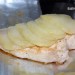 Pon las pechugas de pollo en la bandeja del horno, cúbrelas con las láminas de patata como puedes ver en la galería de imágenes. Añade una pizca de sal sobre ellas y a continuación pon la mezcla de pan crujiente.