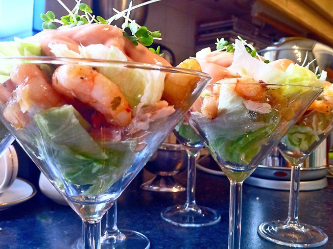 Para los que no tengáis este libro en vuestra biblioteca (debería estar en todas), os contamos que Simone Ortega demanda para su cóctel de gambas lechuga, gambas, huevo duro y mahonesa con coñac y tomate. El servicio lo hace en copa de champán (de las antiguas, abiertas) o en copa de marisco, una base de lechuga, mahonesa, gambas y huevo duro picado.