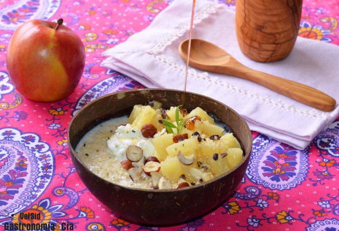 Una buena forma de empezar el día es disfrutando de un desayuno delicioso, y no nos cansaremos de decir que esto es compatible con que sea un desayuno saludable, una cuestión que hay que tener en cuenta para el día a día, no debe ser una moda, debe convertirse en un hábito. Así que continuamos ofreciéndoos ideas con este objetivo, aquí tenéis nuestra receta de Porridge con piña y jengibre, un desayuno sano y rico para sorprender.