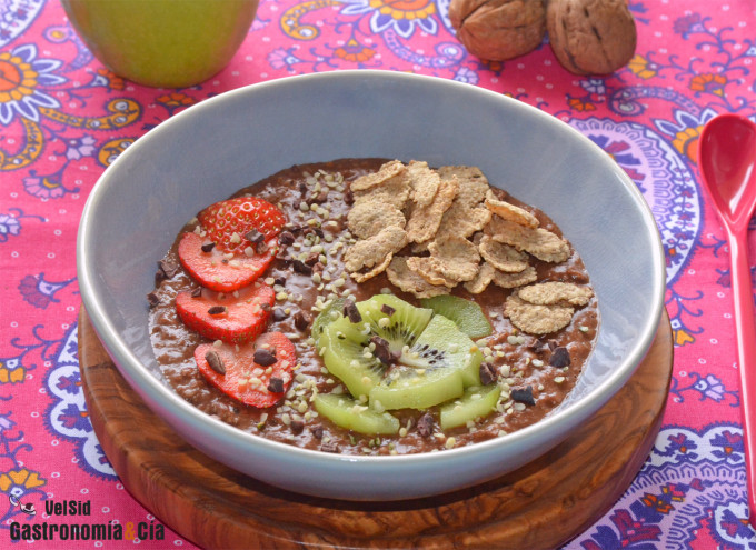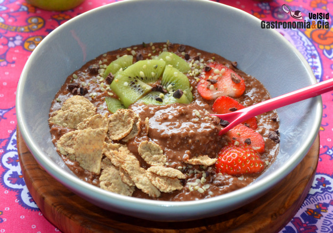 Habitualmente añadimos frutos secos a nuestras gachas para que aporten textura y también las grasas saludables que necesitamos en esta primera comida, pero otras veces utilizamos cereales de desayuno, siempre eligiendo unos que sean saludables, sin azúcares añadidos y sin sal, simplemente cereales integrales, como pueden ser los de trigo y arroz que hemos utilizado en este Porridge crujiente de avena, trigo y arroz con chocolate y fruta.