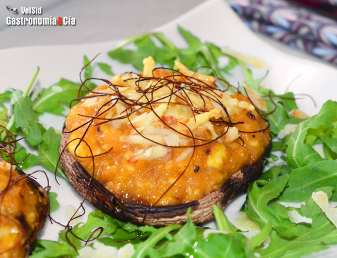 Sirve los champiñones Portobello en los platos, puedes colocar como base unas hojas de rúcula, ralla un poco más de queso ahumado y termina con un poco de aceite de oliva virgen extra. Opcionalmente, añade unos hilos de ito togarashi. ¡Buen provecho!