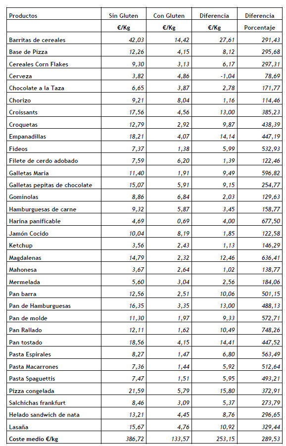 Bajo estas líneas podéis ver la tabla del informe Precios alimentos para celíacos proporcionado por la Federación de Asociaciones de Celiacos de España.
