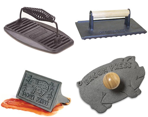 Sobre estas líneas podéis ver varios modelos de lo que es una prensa para bacon, un accesorio de cocina que principalmente se utiliza en los establecimientos de restauración en los que es habitual la elaboración de bacon para desayunos, bocadillos o platos combinados entre otros. Es un utensilio muy antiguo, aunque quizá no esté tan popularizado en España.
