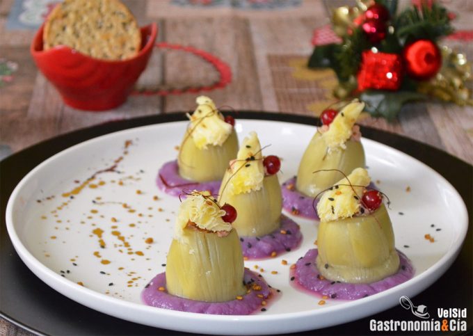 Alcachofas rellenas de foie, Tête de Moine y coliflor morada trufada