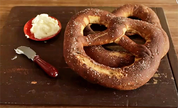 El pretzel es un tipo de masa horneada tradicional de la gastronomía alemana, hay varios tipos de pretzel, dulces, salados, tiernos, crujientes, grandes, pequeños, salpicados con azúcar perla, con sal gruesa, con frutos secos… pero todos se caracterizan por tener la misma forma, es una pieza fina y larga que se entrelaza o anuda en el centro, quedando una forma similar al de las palmeras de hojaldre, pero con una presentación muy diferente como podéis ver en la foto.