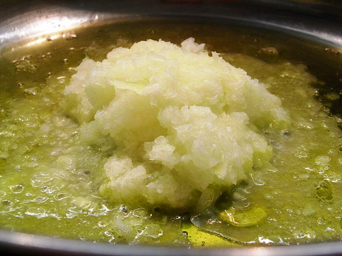 Lo que hago yo es sofreir primero el ajo y así aromatizo el aceite. Luego, retiro el ajo y echo la cebolla y un poco de sal y lo sofrio a fuego muy, pero que muy lento. Cuando la cebolla está casi en su punto, vuelvo a echar el ajo y sofrío un poco más.