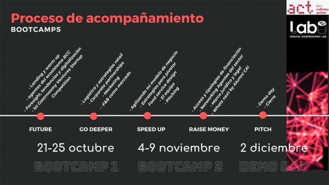 Pues bien, de nuevo hay siete u ocho plazas para la séptima edición del programa de aceleración Culinary Action de LABe, la convocatoria está abierta hasta el próximo 30 de septiembre y se desarrollará en dos bootcamps intensivos, del 21 al 25 de octubre y del 4 al 9 de noviembre de 2019. El programa se cerrará con el día de la demostración ante los inversores, y será el día 2 de diciembre.