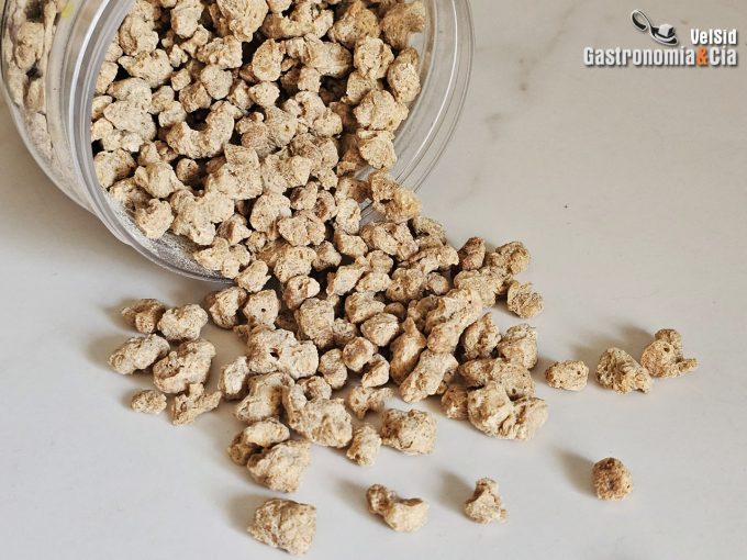 La proteína de soja texturizada o proteína vegetal texturizada (no debe confundirse con la proteína vegetal hidrolizada) es un ingrediente muy versátil, tiene muy poco sabor y tras su necesaria rehidratación ofrece una textura fácil de trabajar en la cocina, como una carne picada por ejemplo, como ya os hemos mostrado en la receta de Hamburguesa de soja crujiente.