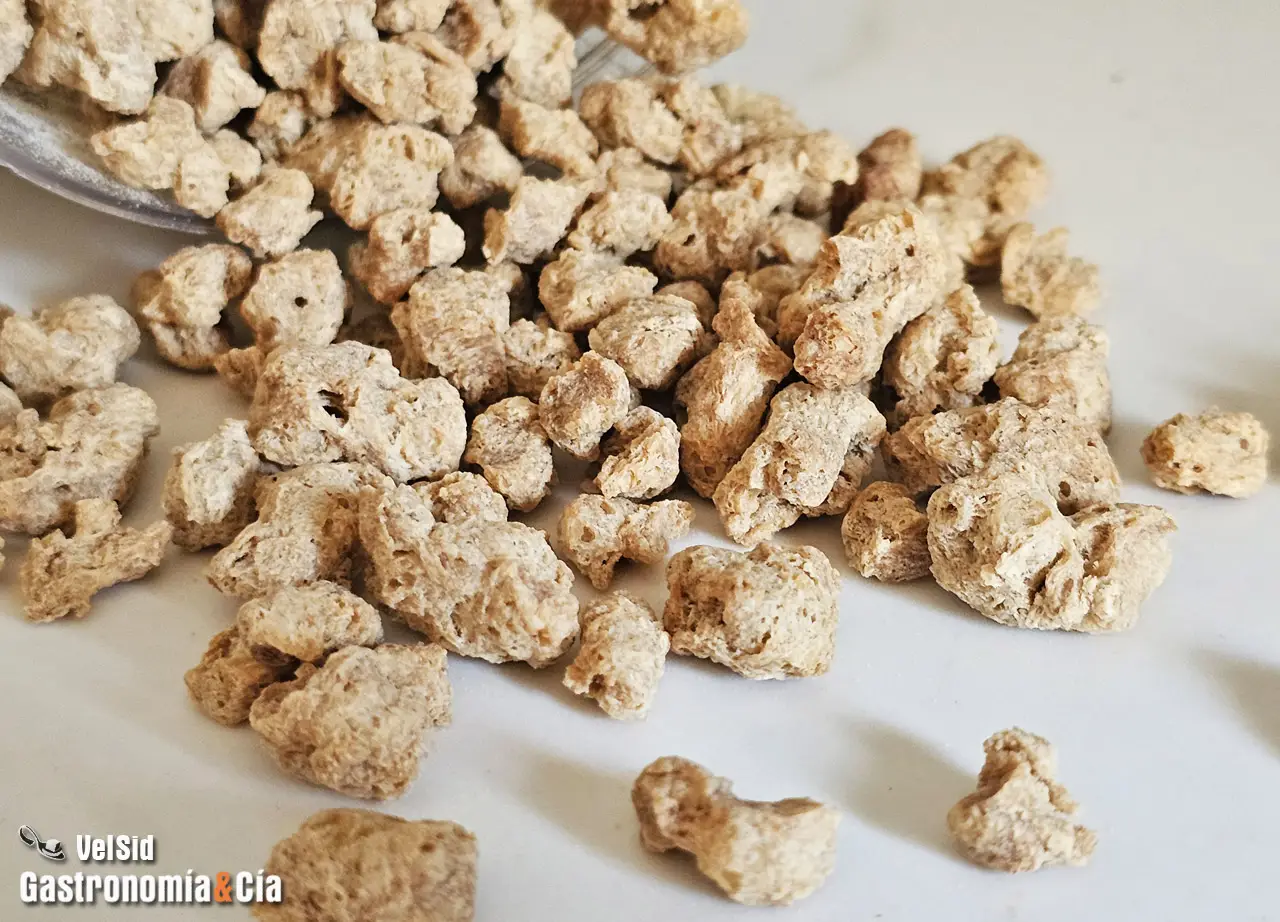 La proteína de soja texturizada o proteína vegetal texturizada (no debe confundirse con la proteína vegetal hidrolizada) es un ingrediente muy versátil, tiene muy poco sabor y tras su necesaria rehidratación ofrece una textura fácil de trabajar en la cocina, como una carne picada por ejemplo, como ya os hemos mostrado en la receta de Hamburguesa de soja crujiente.