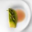 Por último, colocar otras seis rodajas, una entre cada dos de las que forman el círculo. En cada rodaja de puerro poner una gota de aceite. Poner cuatro gotas de jugo de merluza picante por encima, las uvas rojas y terminar con dos briznas de cada hierba.