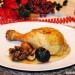 Pon la pularda en la bandeja del horno y frótala por todas partes con el resto de la marinada, déjala boca abajo, con las pechugas tocando la bandeja del horno para que tarden más en empezar a hacerse que con el calor directo de la parte superior del horno y así queden más jugosas. Pon en la bandeja los dientes de ajo y moja con el calvados.
