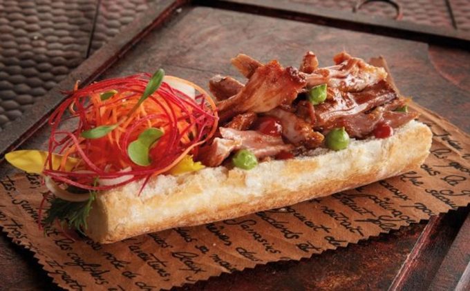 Cortar la barra de pan en cuatro trozos y abrirlos por la mitad. Poner el cerdo deshilachado y aliñado con el jugo de la cocción repartido a lo largo del pan.