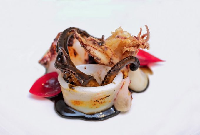 En la base del plato vertemos una cucharada de la salsa, colocamos tres trozos del chipirón de pie y dentro de uno de esos trozos ponemos el rejo frito, en otro el pulpito guisado con la salsa. Alrededor colocamos la cebolleta.
