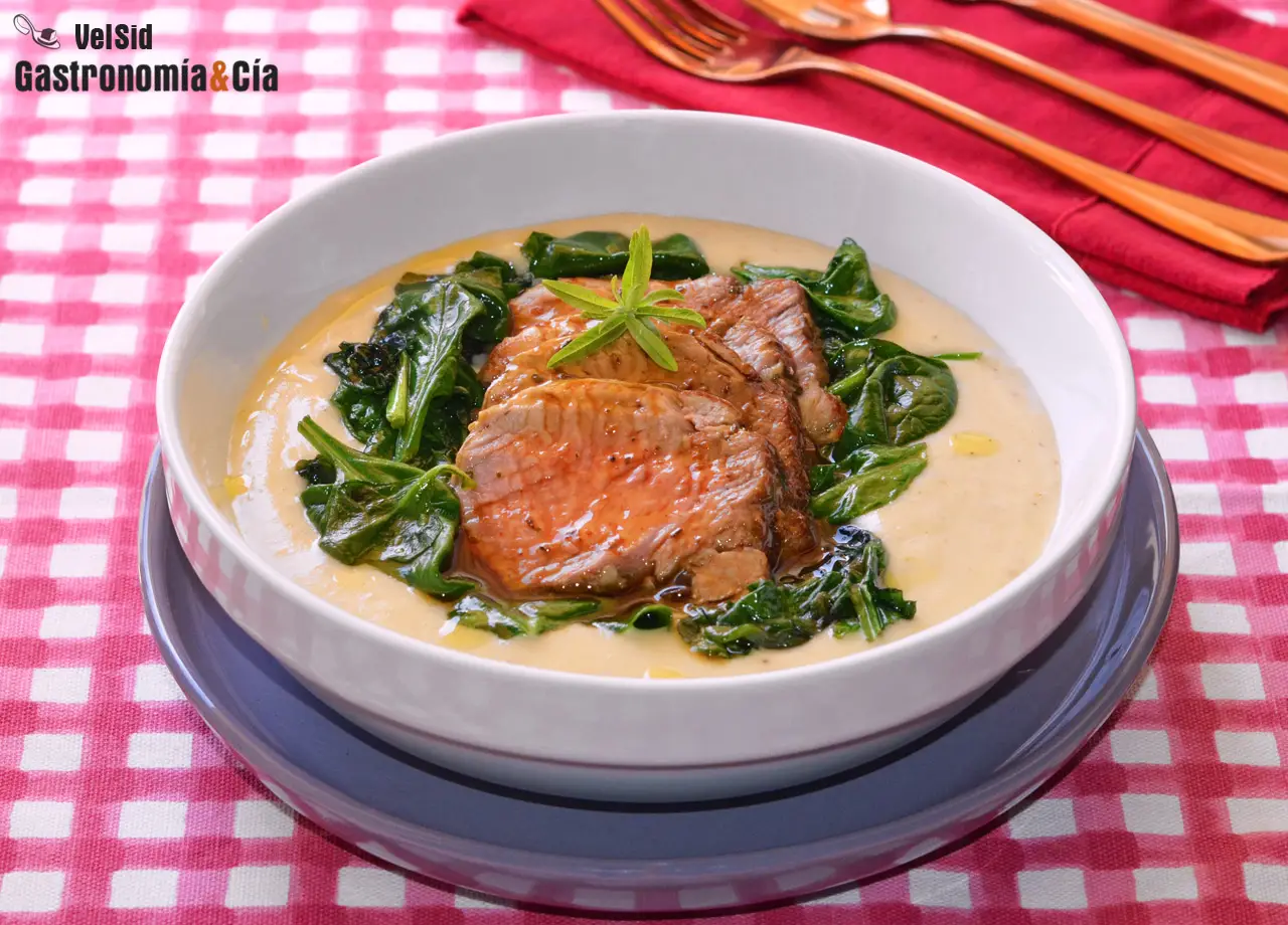 Debemos decir que este puré de patatas con espinacas y solomillo está tan rico, que merece la pena cocinar cada elemento del plato para disfrutarlo, incluso podéis hacerlo con el solomillo como protagonista, sería, entonces, un solomillo de cerdo con puré de patatas y espinacas. Pero también podéis tomar esta idea para hacer vuestra versión, por ejemplo, con las sobras de un pollo asado, o salteando unas rodajas de butifarra fresca o cualquier alternativa vegetal a la carne, si preferís.