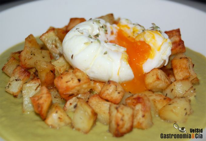 Crema de calabacín y queso de cabra con picatostes y aceitunas