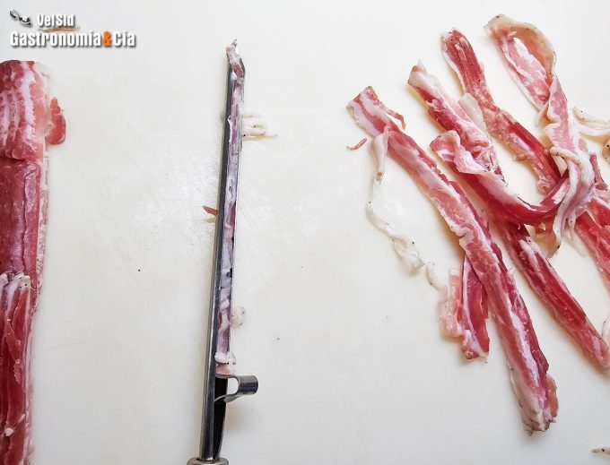 Empezamos por la selección de la carne, debe ser una pieza de carne de buena calidad y tamaño adecuado. Después se preparan los ingredientes, siendo la panceta, basta con cortarla en tiras de un tamaño adecuado para introducirlo en la aguja.