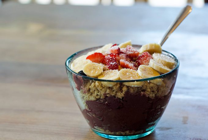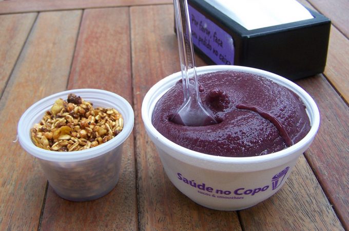 Dicho esto, podéis deducir que el bol de açai es como un smoothie (un batido con frutas congeladas) que contiene el fruto de la palmera de azaí y se sirve en un tazón o bol, vamos, que es como un smoothie bowl (pero siempre con açai). Luego se suelen añadir otras frutas y cereales, en su versión dulce, pues también está la versión salada del ‘açai na tigela’, en el norte de Brasil parece ser que se hace con tapioca, pescado seco o camarones. Pero no es esta versión la más popular en Estados Unidos, en España y en otros países que han adoptado la idea.