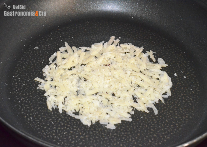 Entonces se pone el queso en la sartén haciendo una capa fina y homogénea, la temperatura del fuego conviene que sea media-baja, para un mejor control de la preparación, y no correr el riesgo de que el queso se tueste demasiado. ¿Cómo tiene que estar el queso? Pues lo normal es utilizar queso rallado y si es recién rallado mucho mejor, pues conserva todo su sabor y está más sabroso, pero también hay la posibilidad de hacer un crujiente de queso partiendo de una loncha muy fina, de todos modos, os recomendamos la primera opción.