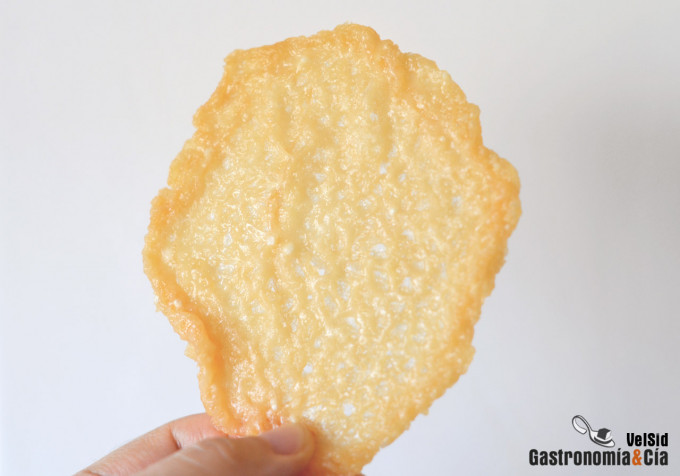 Dicho sea de paso que podemos hacer un crujiente de queso con la forma que deseemos, incluso haciendo una cestita o un cilindro que sirva como ‘cuenco’ o como soporte comestible para una elaboración culinaria. En cualquier caso, conviene hacer una capa fina de queso para que se deshidrate bien y de forma homogénea y quede un crujiente fino y muy agradable a la hora de romper al morder y masticarlo.