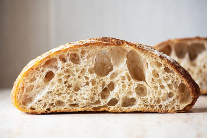Miga abierta y alveolada: La hidratación controlada facilita una textura más ligera y con burbujas de aire dentro del pan.