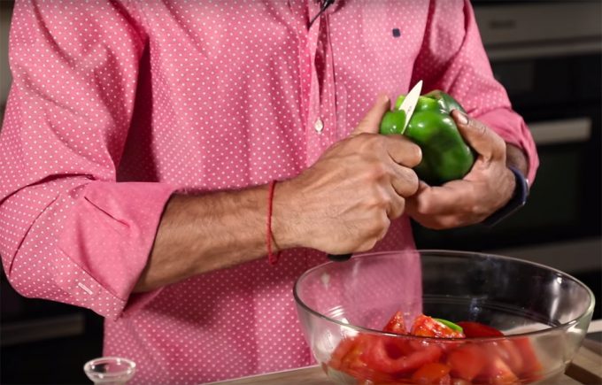 Lo que más sorprende de este vídeo es ver al cocinero con el cuchillo al aire cortando las hortalizas para hacer el gazpacho, a pocos cocineros vemos utilizar esta técnica, porque no deja de ser una técnica de cocina, en los programas de televisión, en los congresos, en los talleres, en su cocina… No obstante, seguramente en su cocina doméstica la utilizan a menudo. Y vosotros, ¿cómo os sentís más cómodos preparando ciertos ingredientes, sobre una tabla o cuchillo al aire?
