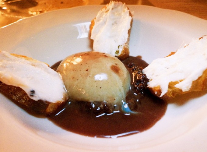 Se trata de un aparentemente sencillo plato de huevos escalfados con salsa meurette, también denominada salsa de Borgoña, pero no se trata de hacer los huevos poché por un lado, la salsa meurette por otro y emplatar, sino de escalfar los huevos en esta salsa de chalotas, tocino y vino tinto. Los Huevos en meurette se acompañan además de pan tostado, a veces frotado con ajo, en otras ocasiones simplemente con unos picatostes.