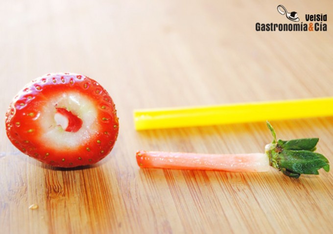 Cuando se quitan tallos o pedúnculos de frutas y hortalizas, se habla de équeuter en el diccionario francés, los rabitos de las cerezas que aparecían en el ejemplo del diccionario, los peciolos de los tomates, de los pimientos, de las fresas (en la foto podéis ver el truco para quitar el pedúnculo de las fresas), los extremos de las judías verdes, el tallo duro de los espárragos…