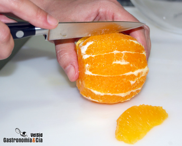 En resumen, pelar a lo vivo es quitar la piel del cítrico llegando incluso a la fina membrana que envuelve los gajos formados por pequeñas vesículas que contienen el jugo de la fruta. Una vez que la naranja se ha pelado a piel, para sacar las denominadas supremas de naranja hay que cortar con el cuchillo a cada lado del gajo. A diferencia de un gajo de naranja extraído tal cual de la pieza, que se presenta con un aspecto blanquecino y seco por la membrana que lo recubre, la suprema muestra el brillante color de la fruta y su jugosidad, es de lo más apetecible.