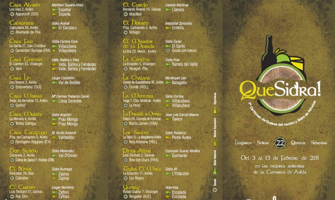 Participan en QueSidra! 22 sidrerías y restaurantes de la Comarca de Avilés, podéis conocer cuáles son en la imagen inferior, clicando sobre ella se ampliará y descubriréis, además de los establecimientos, los quesos que cada uno ofrece y las sidras que se podrán degustar.
